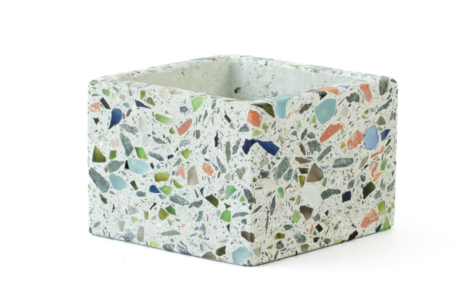 廃ガラスや瓦、広川青石などの端材とセメントと混ぜて成形。大理石のような模様と、ひとつひとつ異なる表情が趣深くインテリアのアクセントとして彩りを与えます。 大きさ70×70×60㎜